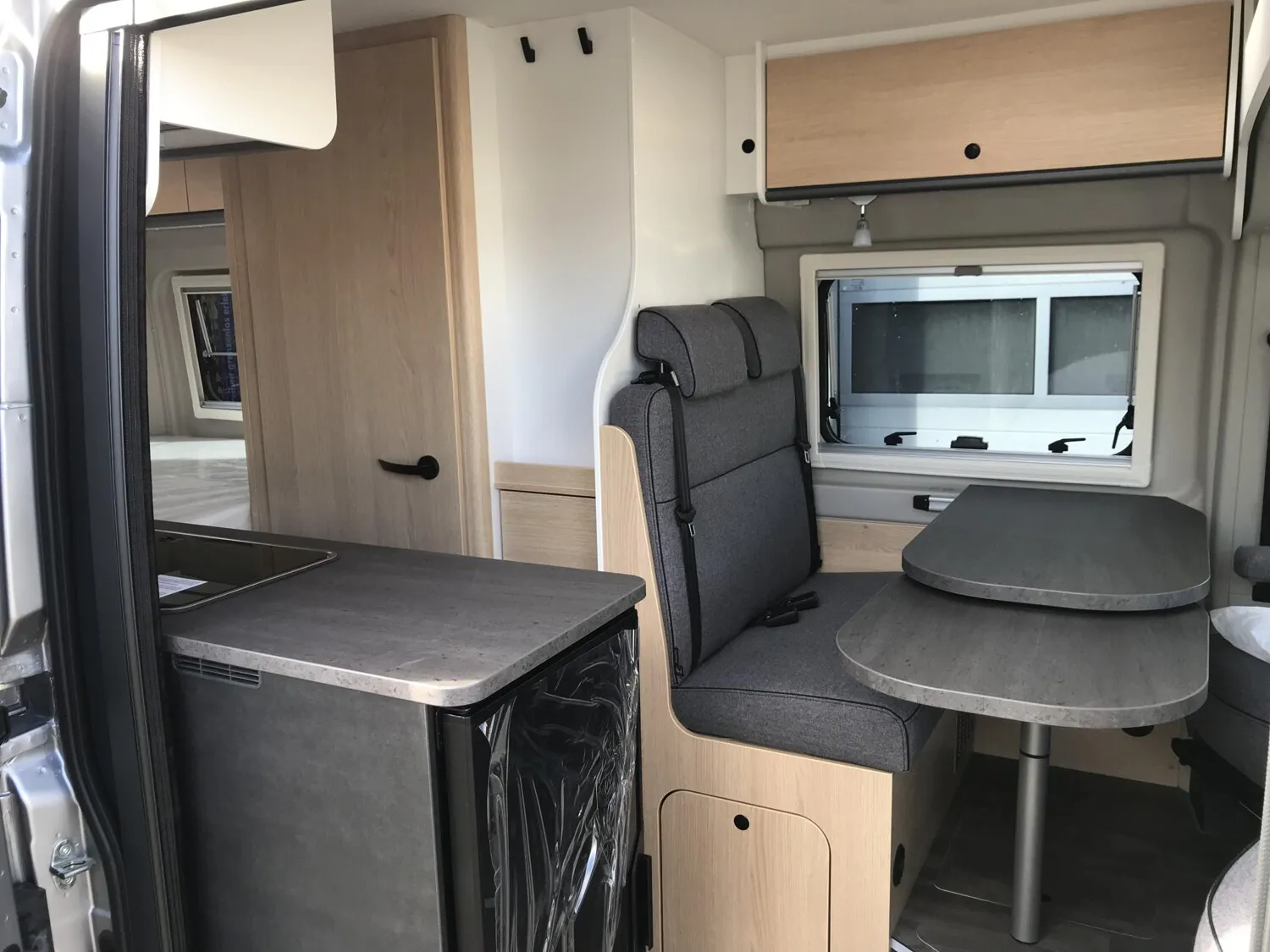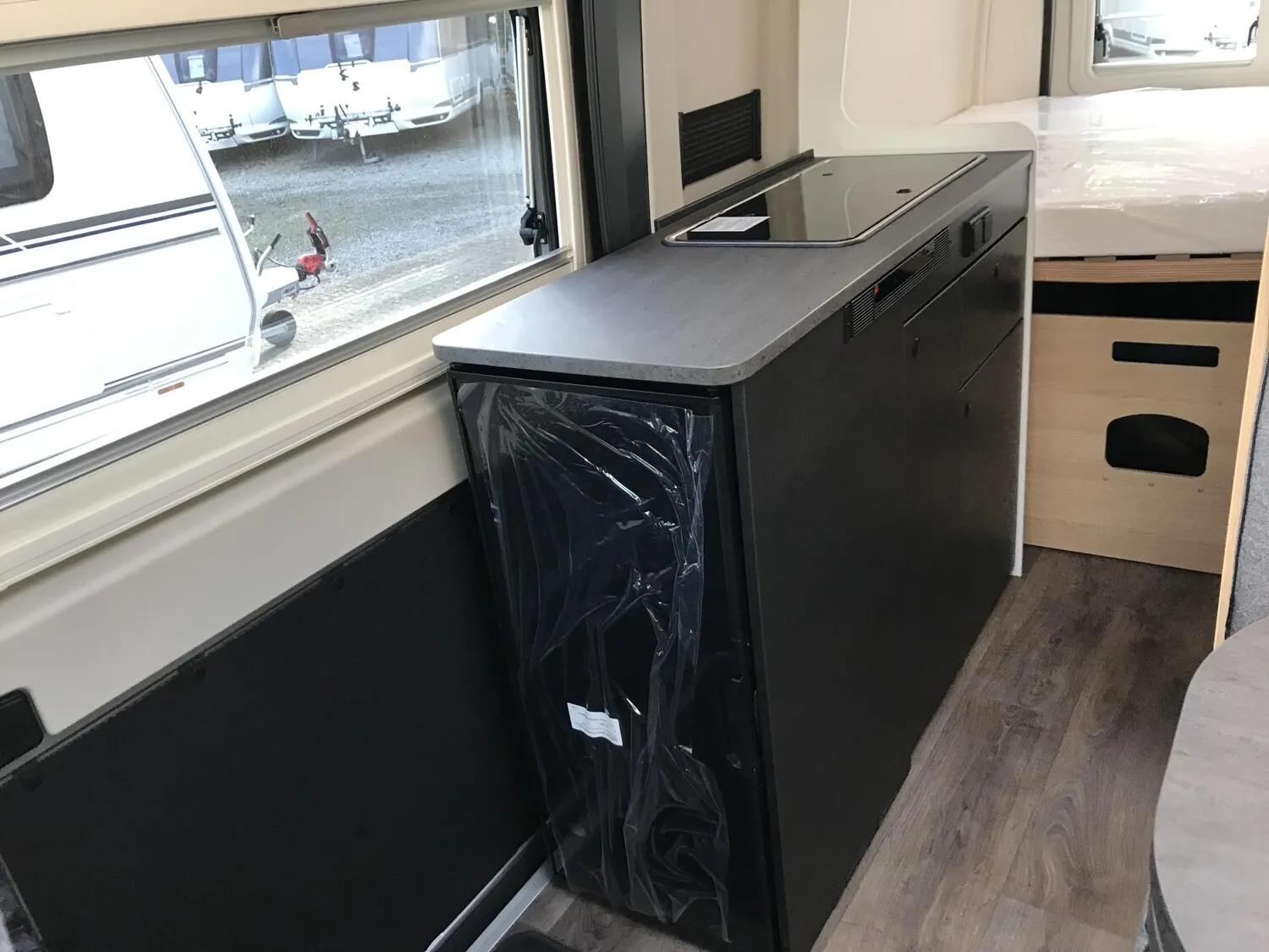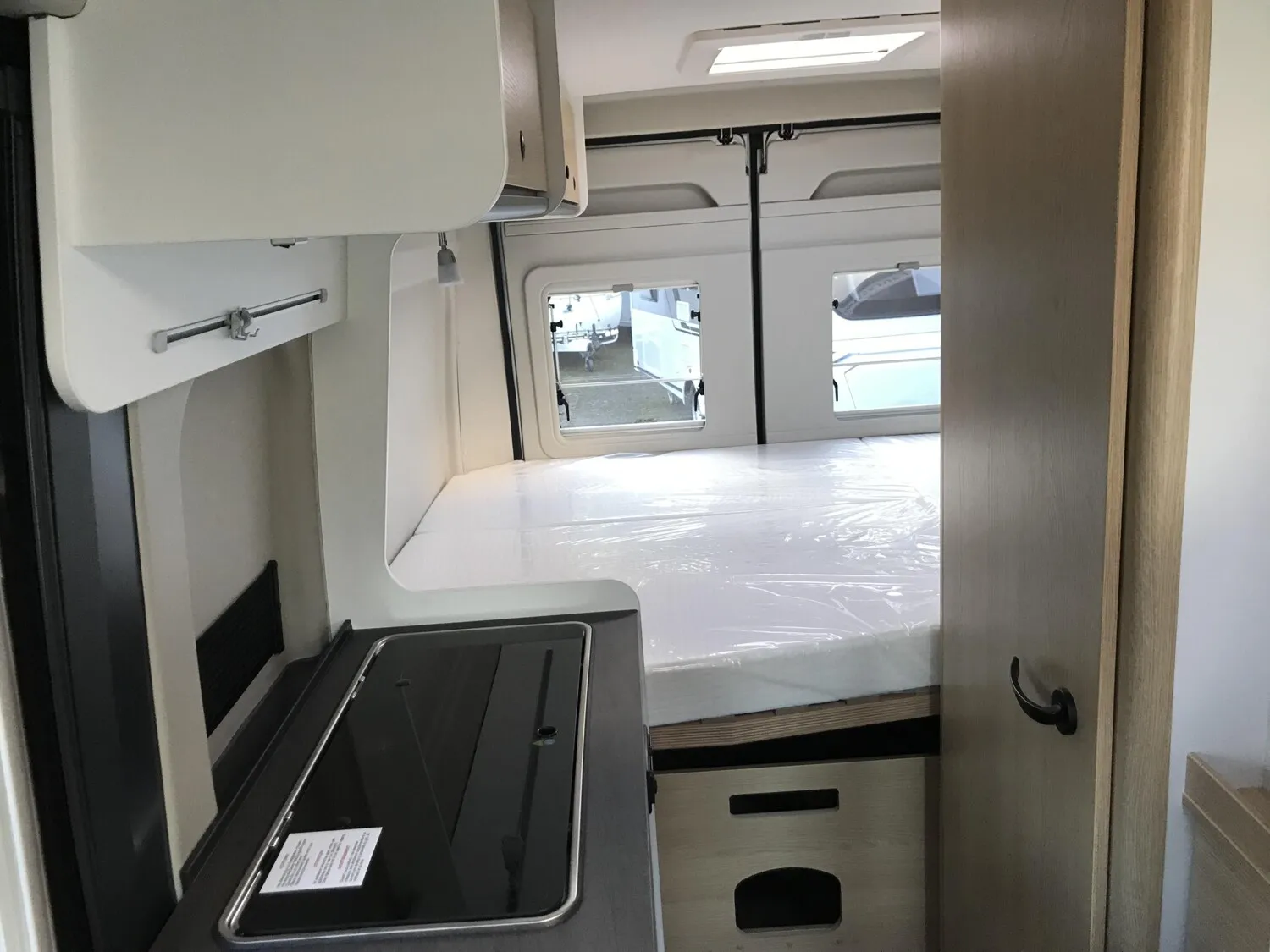 - Basic Paket (Panoramadachhaube 70 x 50 cm, Duschausstattung, Fenster im Bad, Kleiderstange in der Nasszelle, Breite Einstiegsstufe, Drehplatte für Tischerweiterung an der Sitzgruppe)