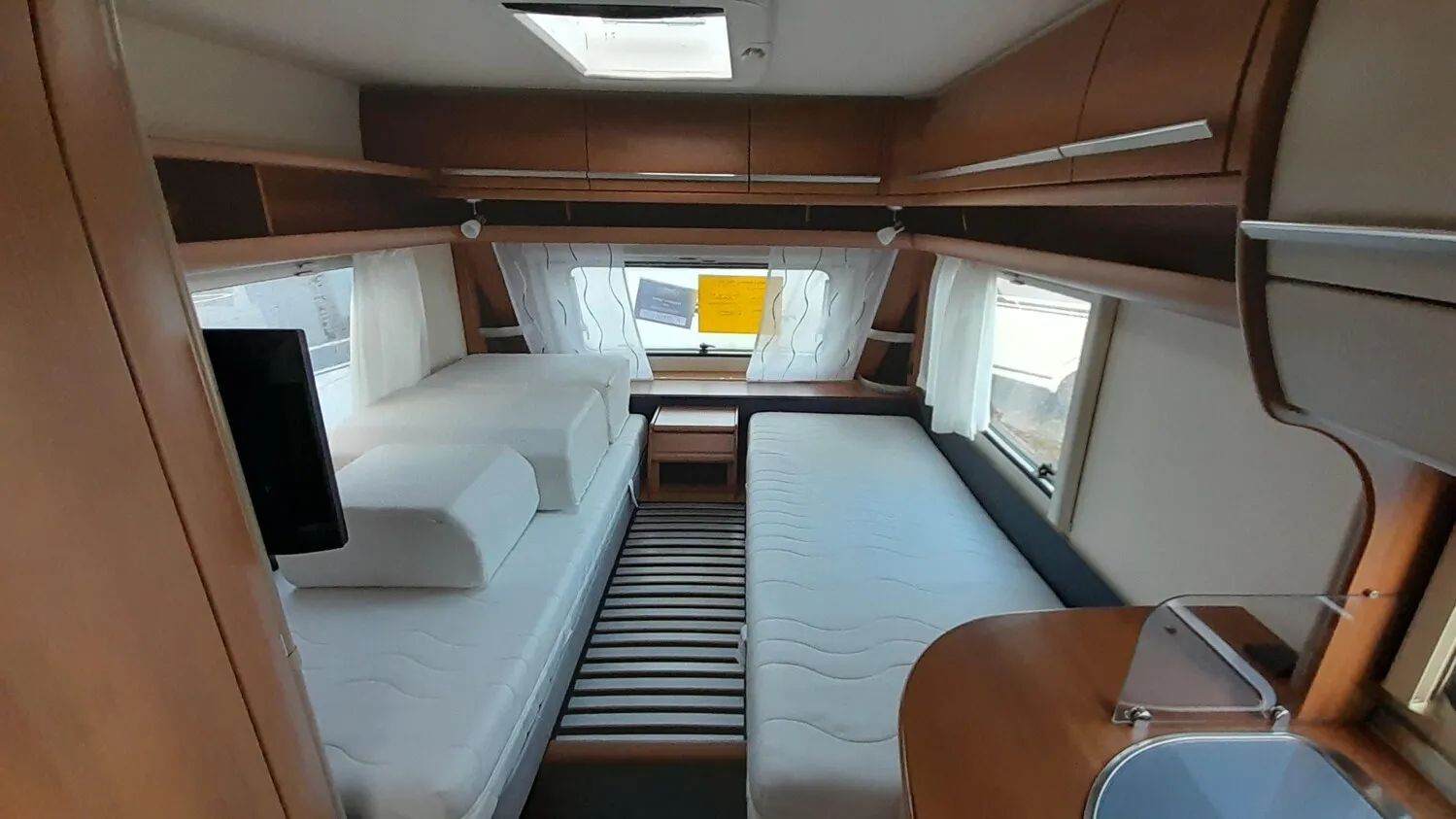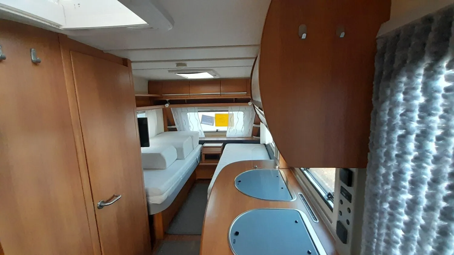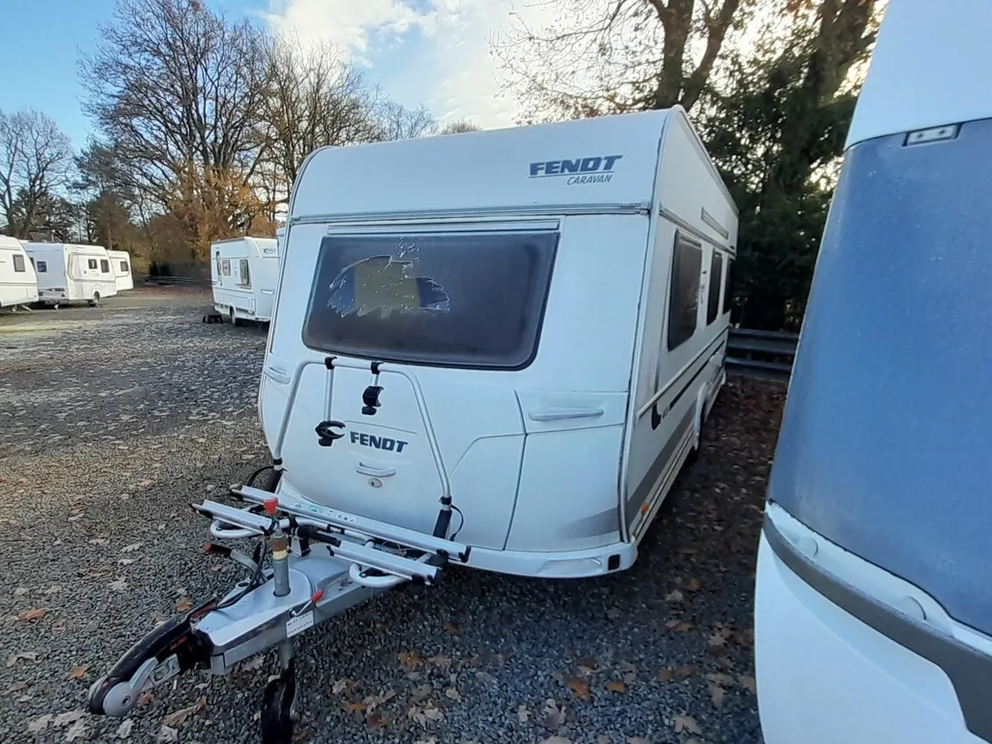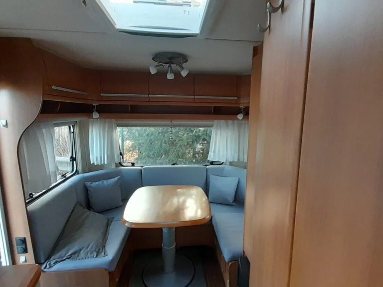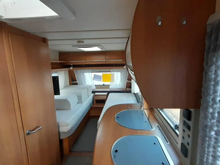 Fendt Bianco 465 TG mit Hecksitzgruppe und zwei Einzelbetten im Bug.