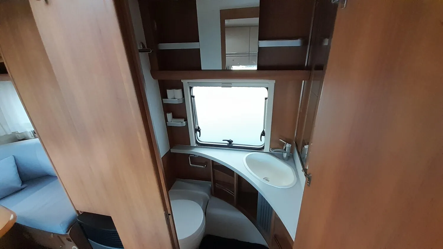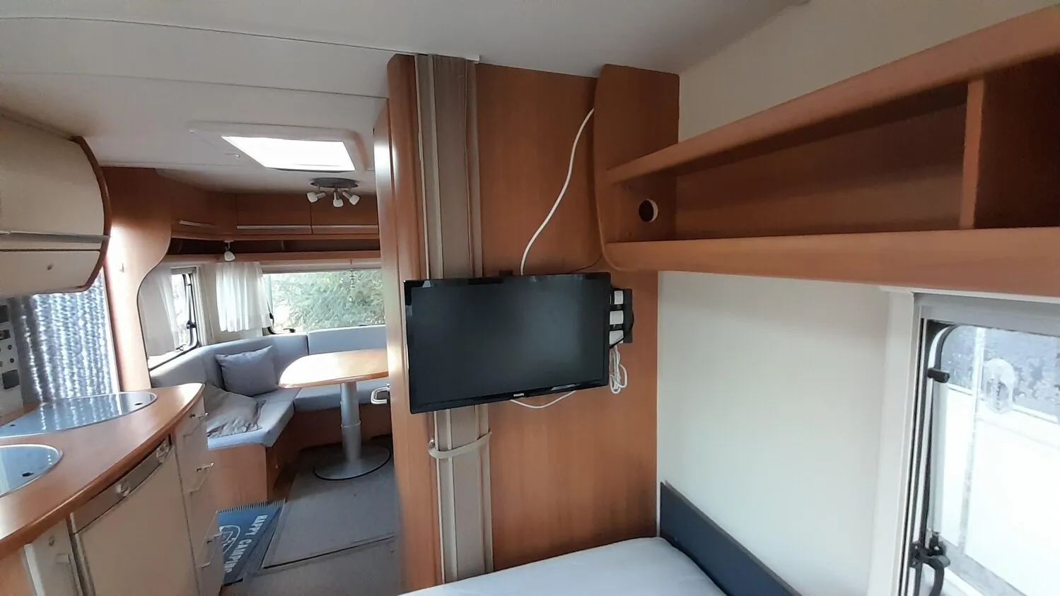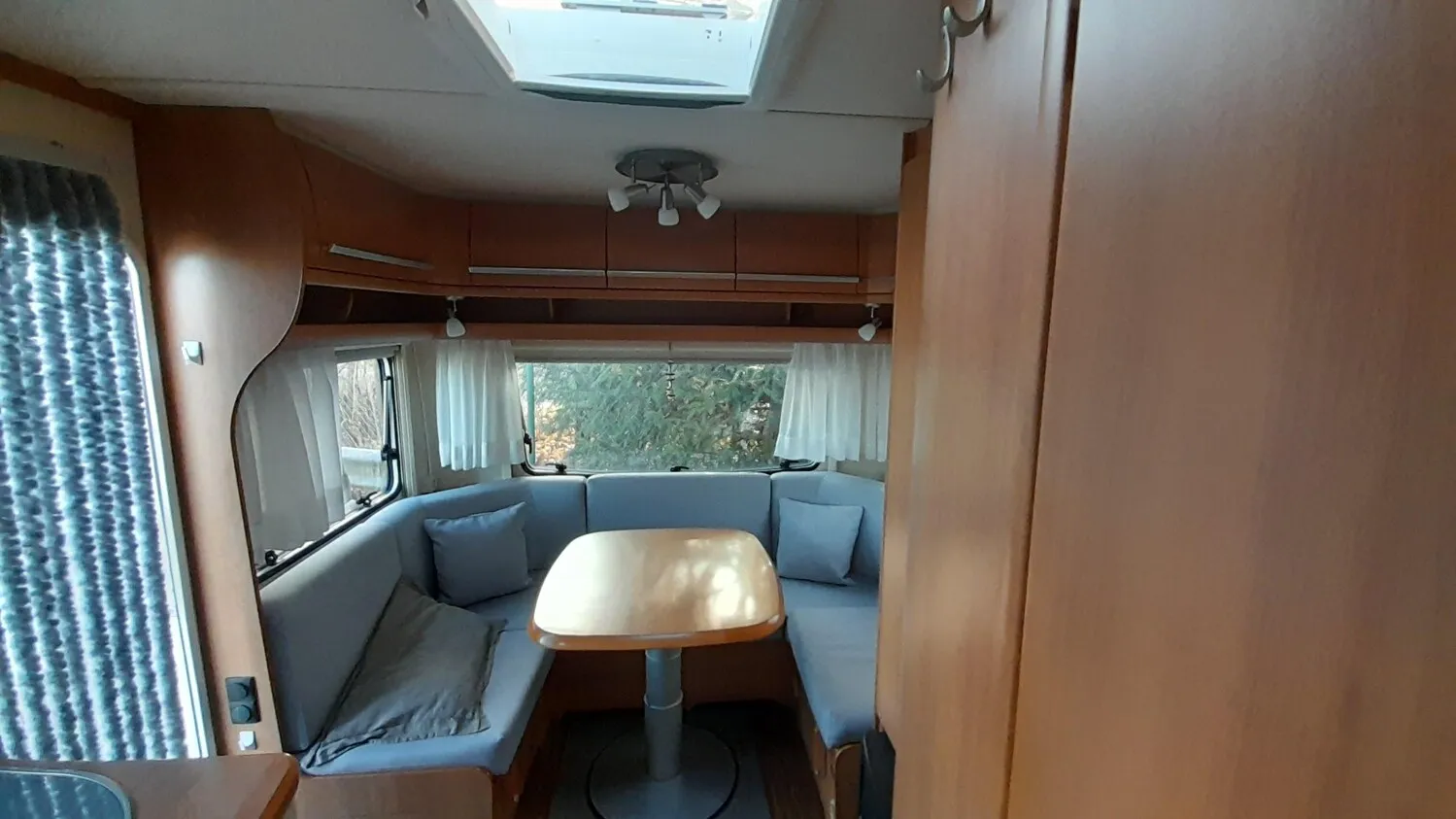 Fendt Bianco 465 TG mit Hecksitzgruppe und zwei Einzelbetten im Bug.