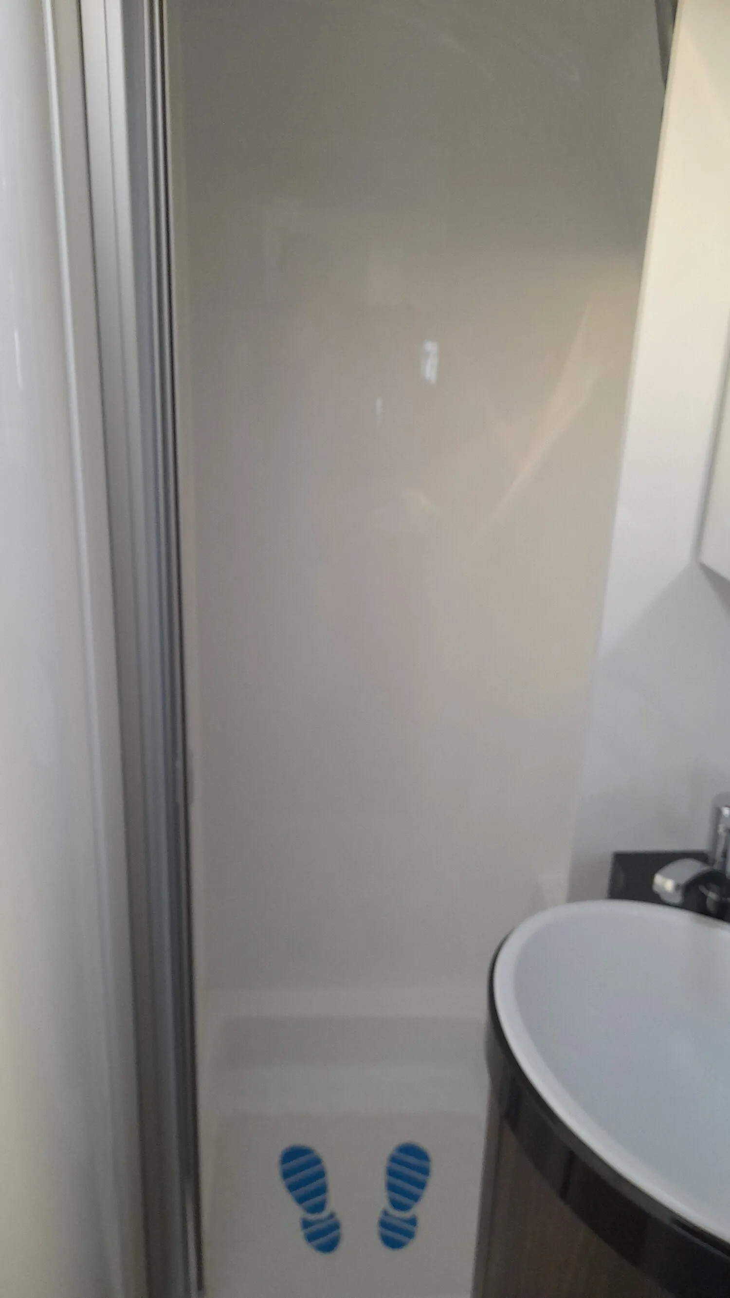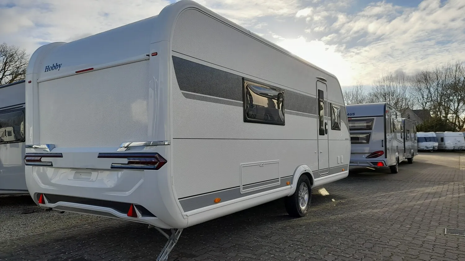 Hobby Prestige 560 WLU, Modell 2025, mit Einzelbetten Heckbad über die gesamten Fahrzeugbreite mit separter Dusche, Rundsitgruppe im Bug.