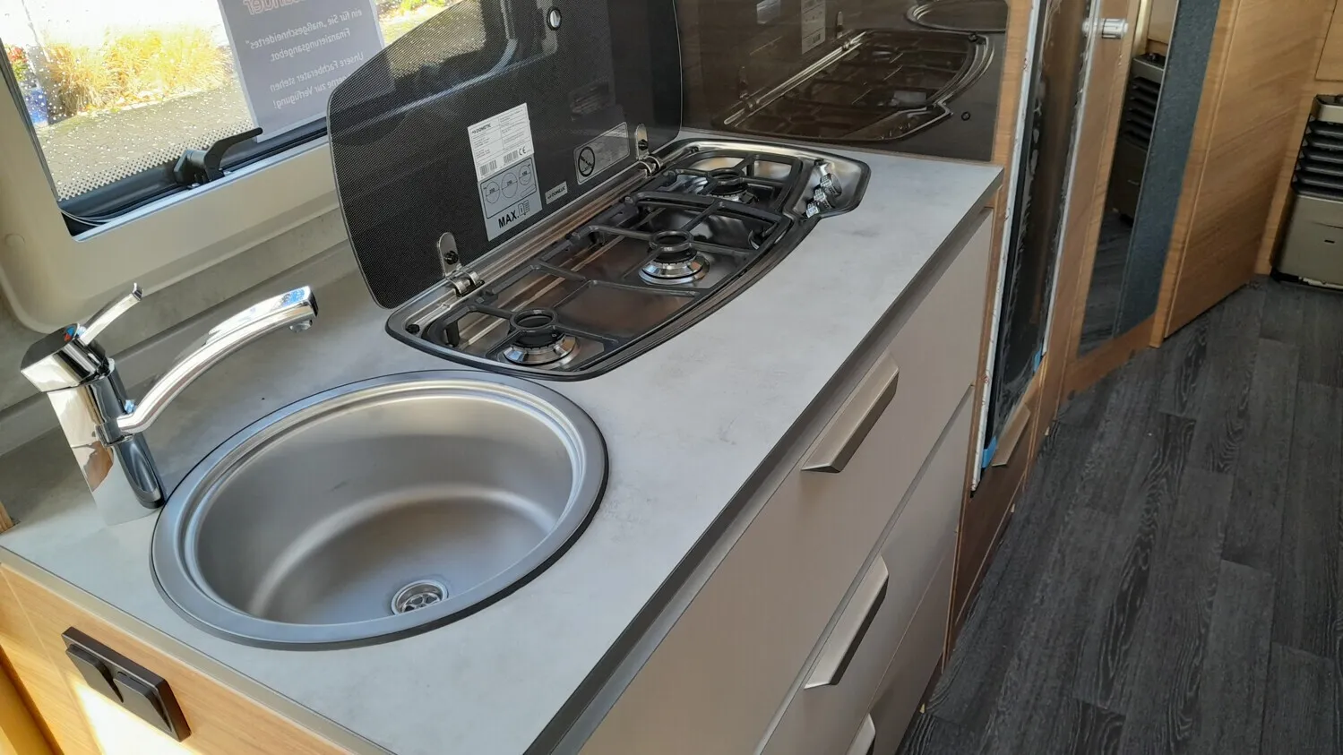 - Plus-Paket (Seifen- und Spülmittelspender, Dachhaube (Hebe-Kipp) 96 x 65 cm, mit Insektenschutz und Verdunklung (Bug), Wasserfiltersystem "bluuwater", MediKit Gutschein, AL-KO AAA Premium Brake, Stützrad mit integrierter Stützlastanzeige, AL-KO Schwerlastkurbelstützen, Insektenschutztür)