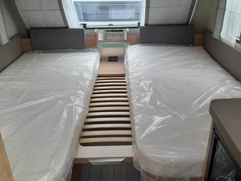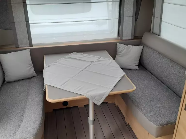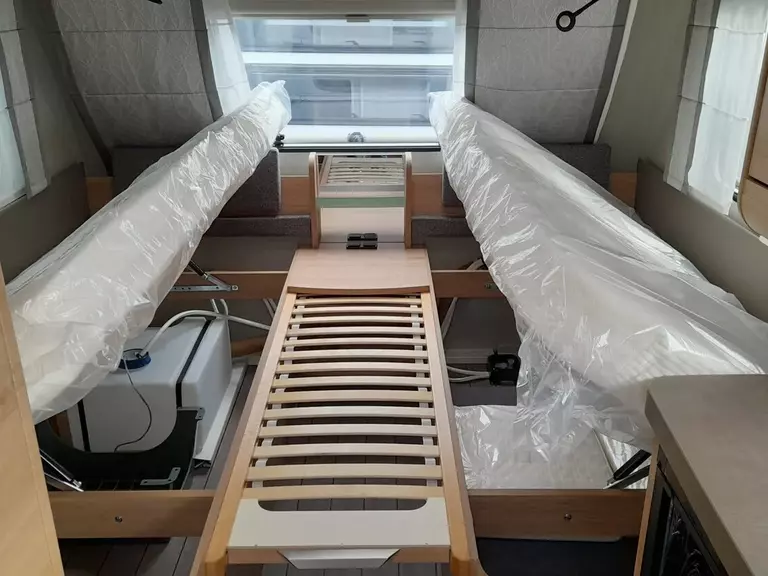 Einzelbetten im Bug, Sitzgruppe mit Einhängetisch im Heck.