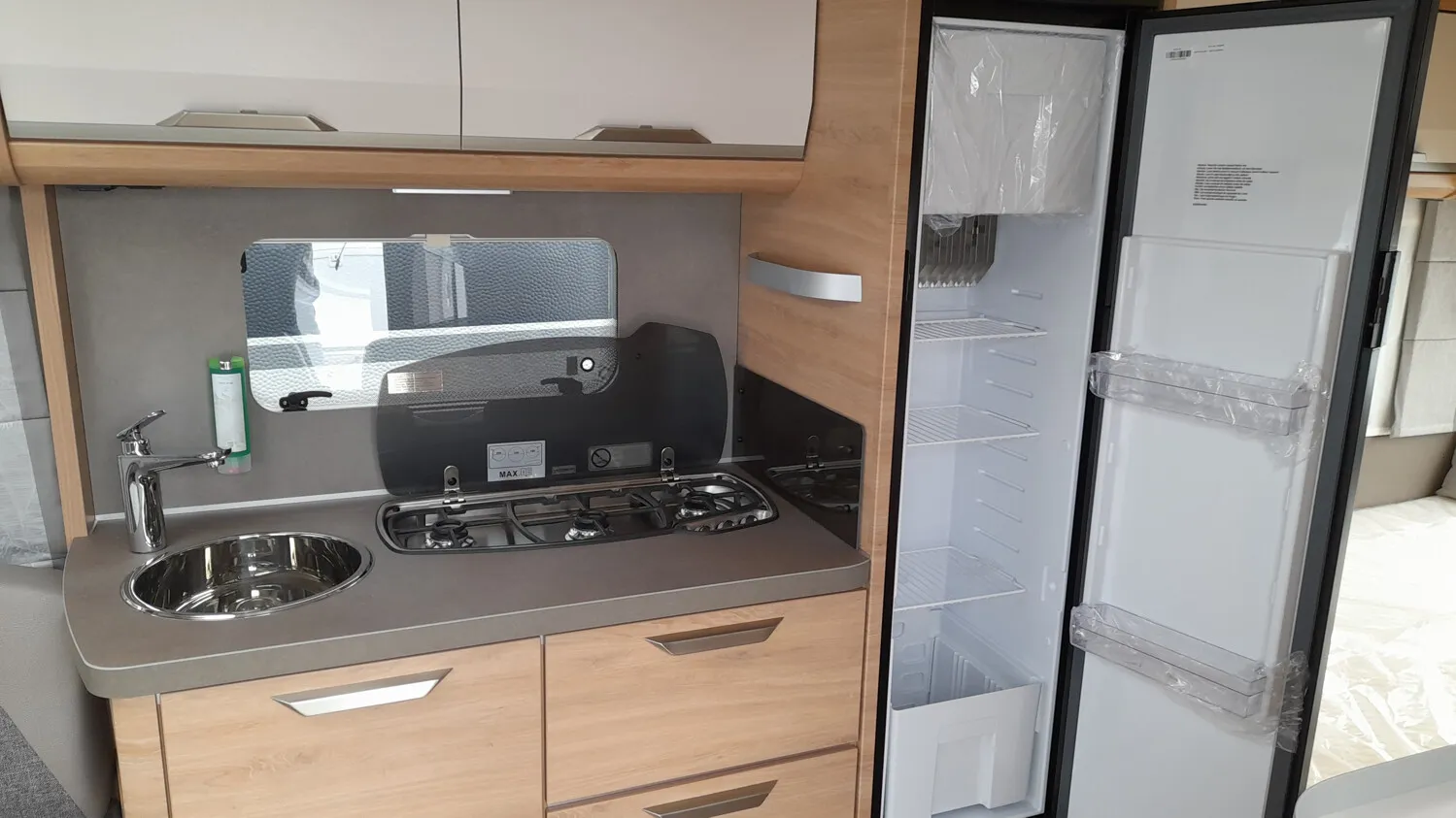 - Gas Paket (Gasschlauch Ausführung D/AT/ES/FI/BE/IT/NL/DK, Gasanlage 30 mbar, Kühlschrank 142 Liter, Gasregler Ausführung D/AT/ES/FI/BE/IT/NL/DK, 3-Flammen-Kocher mit elektrischer Zündung, Glasabdeckung und Spülbecken in Edelstahl, Heizung TRUMA VarioHeat, Gaskasten mit Außenklappe)