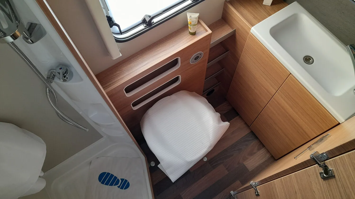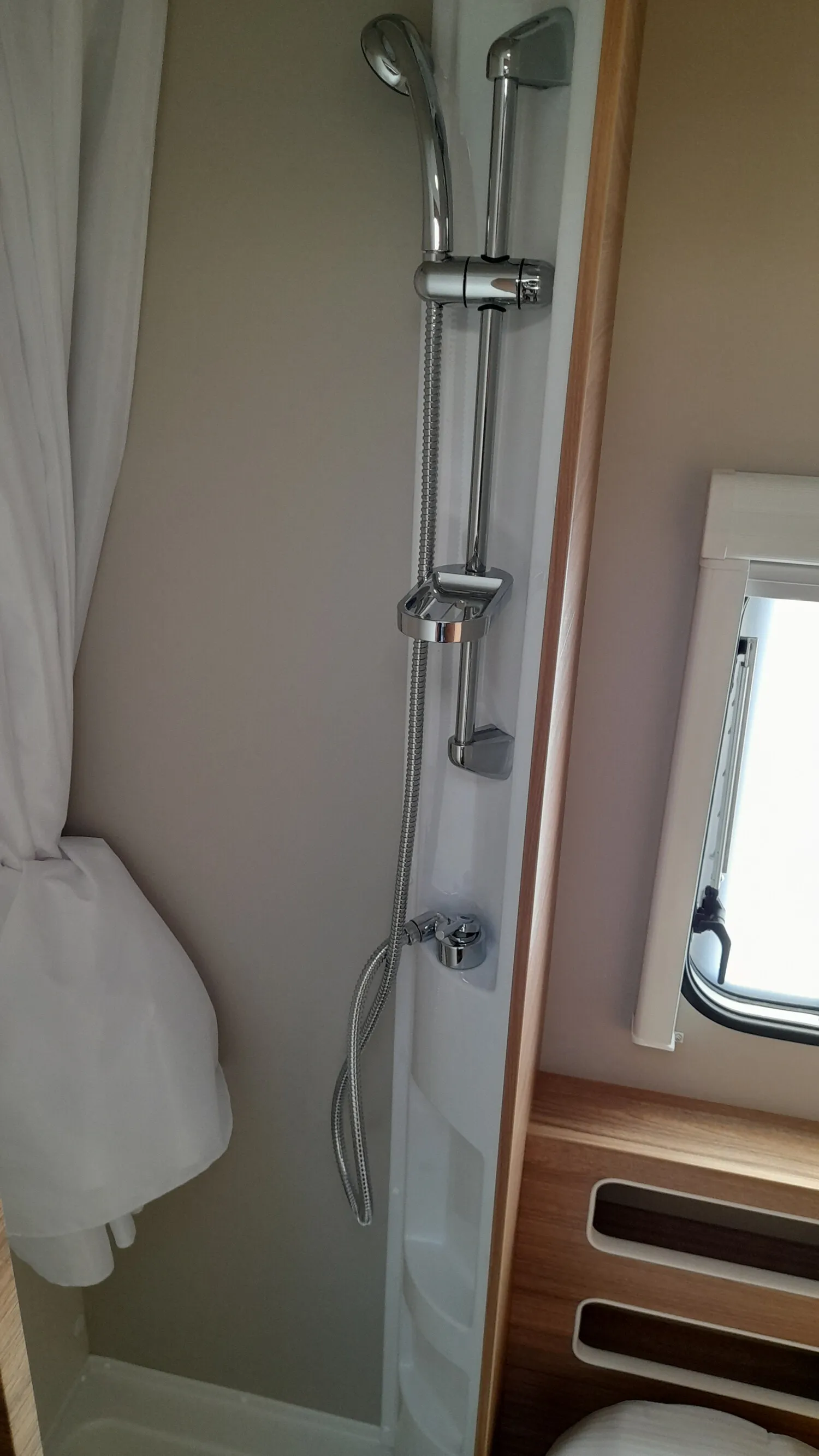 - Duschausbau Waschraum: Brausearmatur mit Halter und Duschvorhang